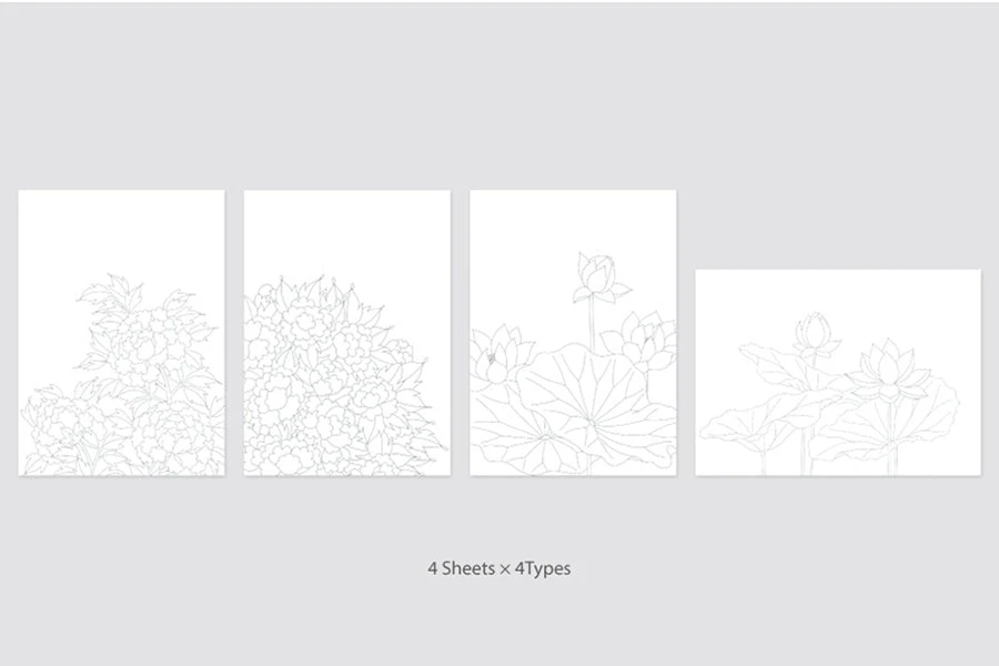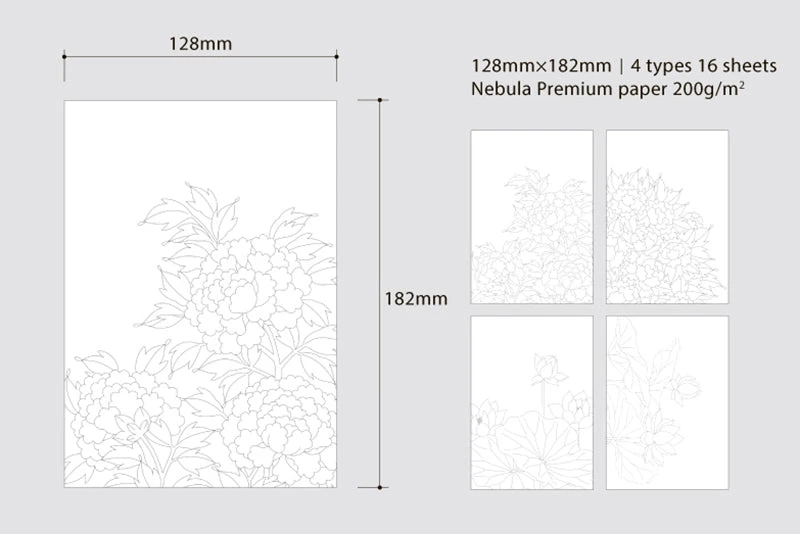 Printed on Nebula Premium paper, this set of 16 contains four sheets each of 4 different floral patterns. The paper, weighing in at 200g, is able to hold fountain pen ink without bleedthrough. Each sheet is 128mm wide by 182mm tall (just over 5″ x 7″).