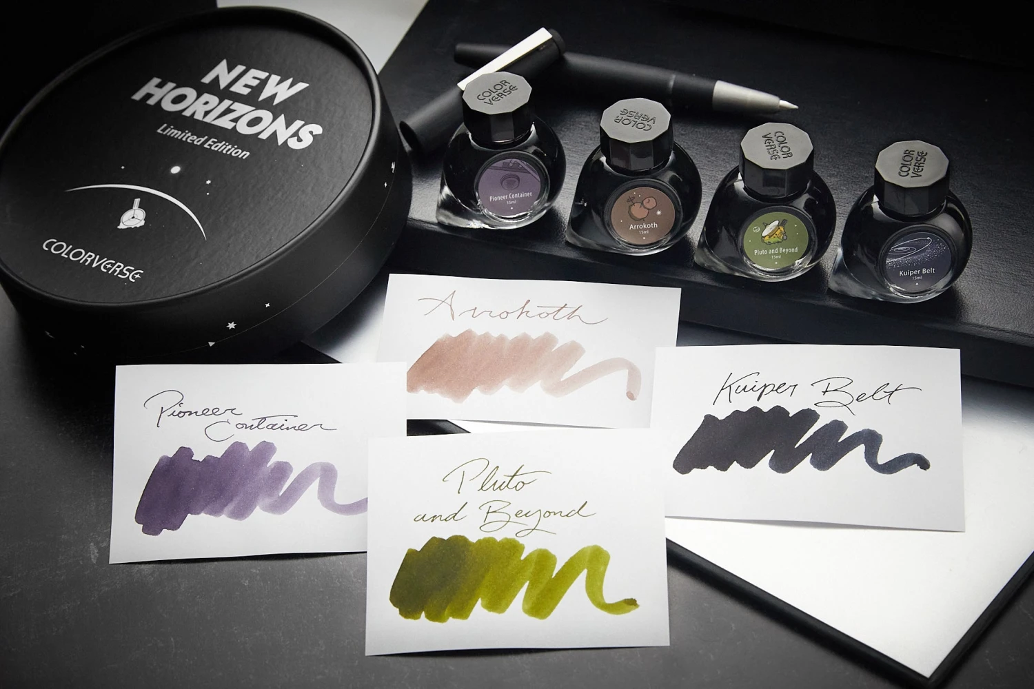 Colorverse has done it again! Introducing the limited edition New Horizons ink set. This ink set of four 15 ml bottles was made to commemorate the New Horizons spacecraft which granted humans access and understanding to the most remote and unexplored regions in space.