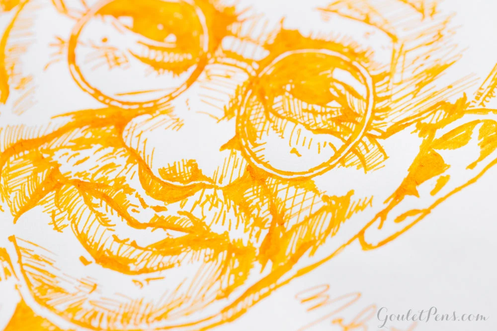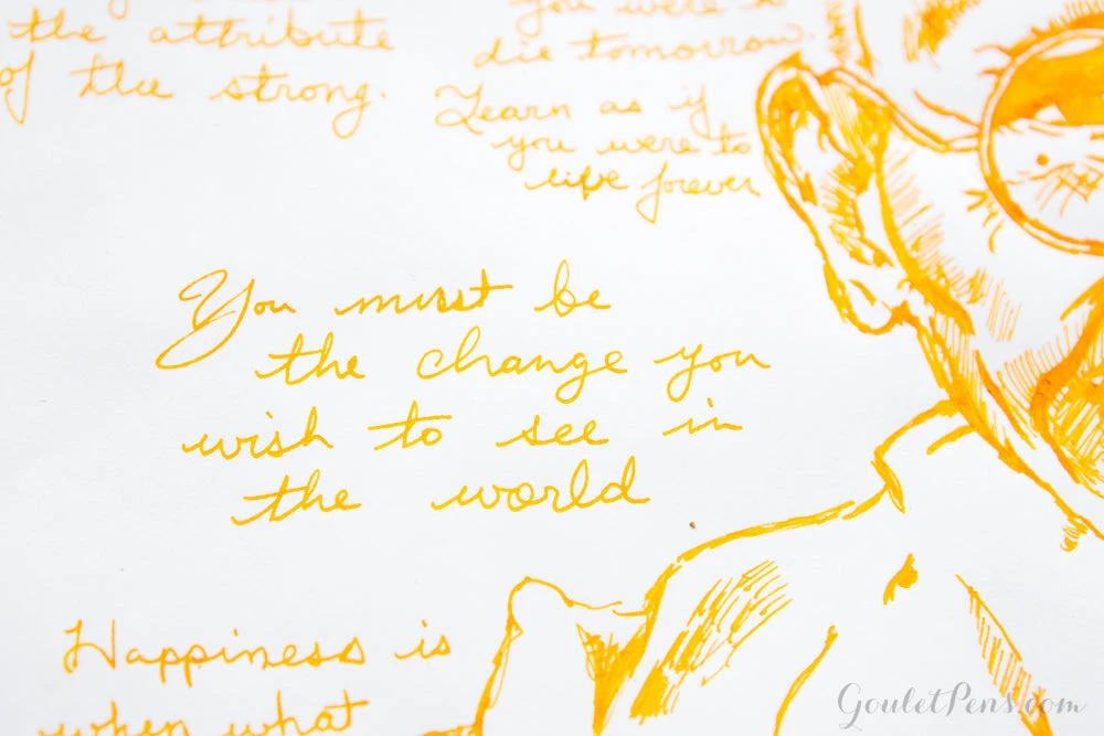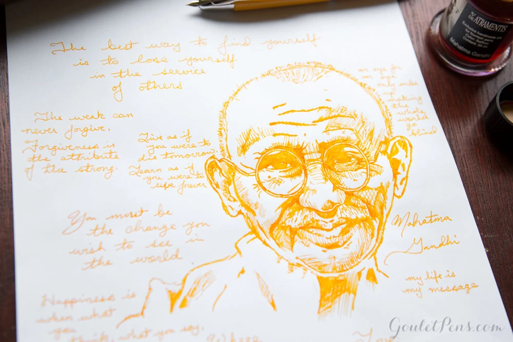 De Atramentis fountain pen inks are exclusively handmade in Germany by Dr. Franz-Josef Jansen, and come in a 45ml glass bottle. This is a saffron yellow color, and has a picture of Mahatma Gandhi on the bottle label.
