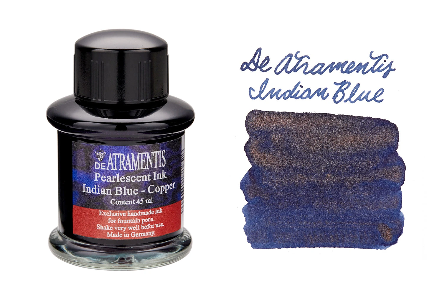 This dark blue fountain pen ink features added copper pearlescent shimmer. Shimmering inks work best with broader nibs on high quality paper to really see the shine. De Atramentis fountain pen inks are exclusively handmade in Germany by Dr. Franz-Josef Jansen, and come in a 45ml glass bottle.