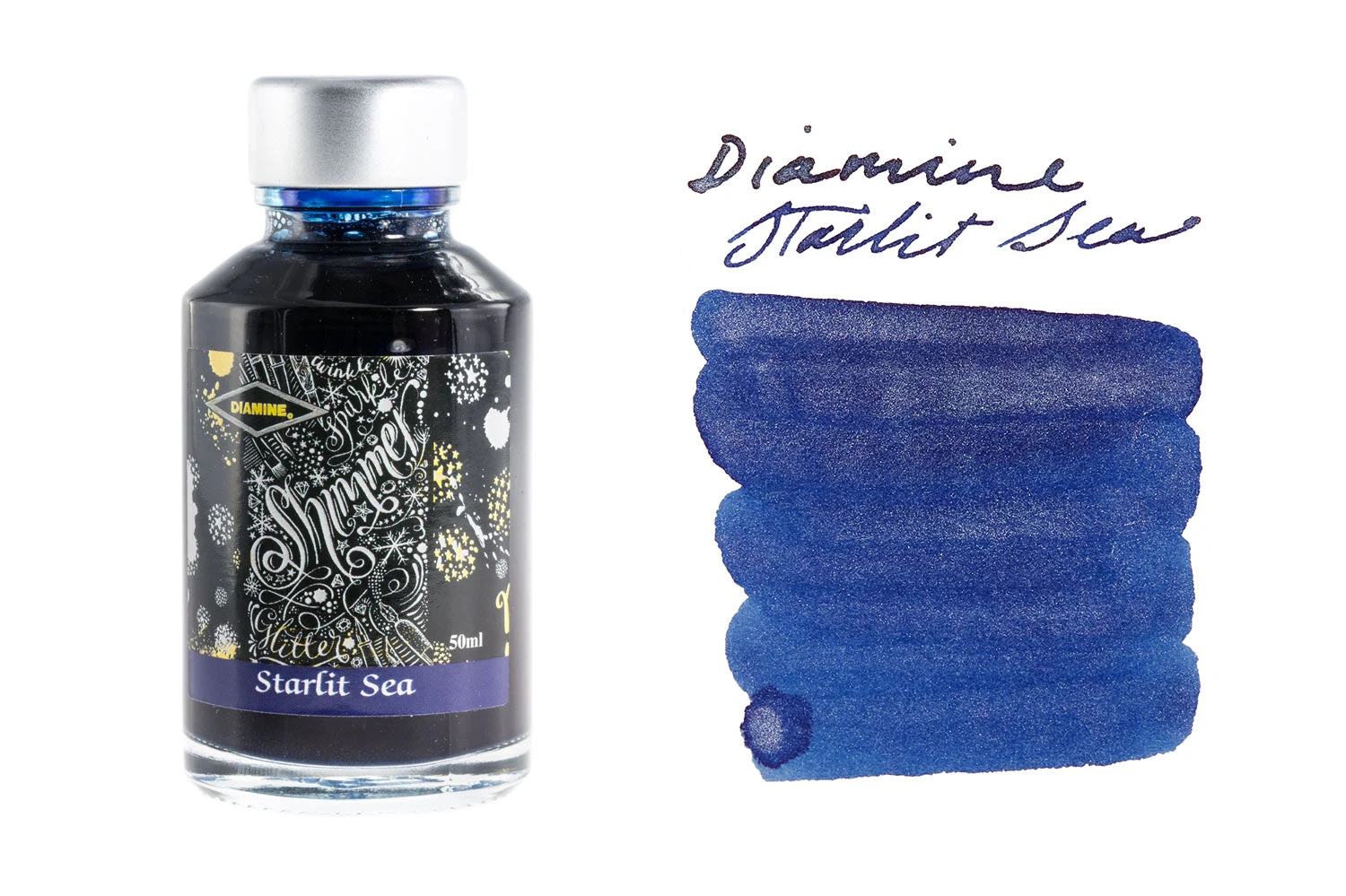 Part of Diamine’s Shimmertastic collection, this Starlit Sea blue fountain pen ink features added silver shimmer. Works best with broader nibs on high quality paper to really see the shine. Comes in a 50ml glass bottle.