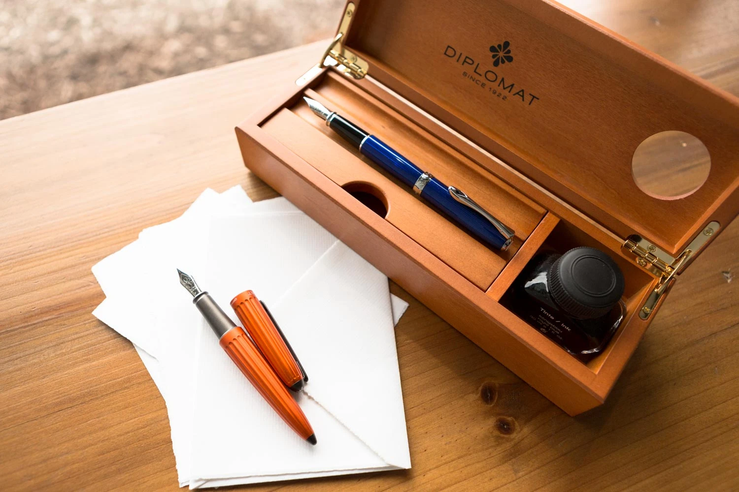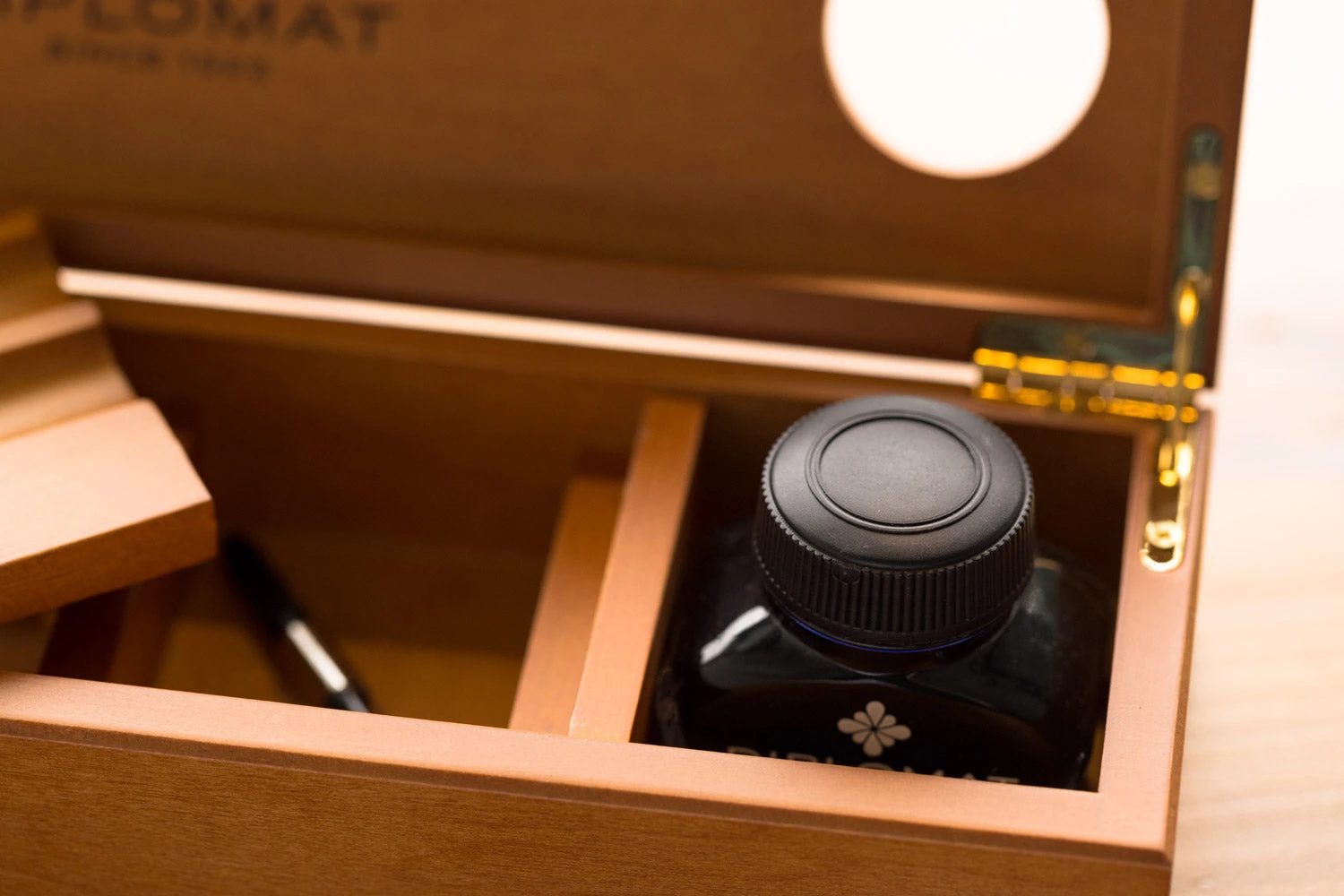 This light wood pen holder is a must-have desk accessory. It accommodates a small bottle of blue ink (included!) and has a removable writing instrument tray with slots for up to two pens. Underneath this tray you’ll find an accessory compartment for spare converters, cartridges, etc.