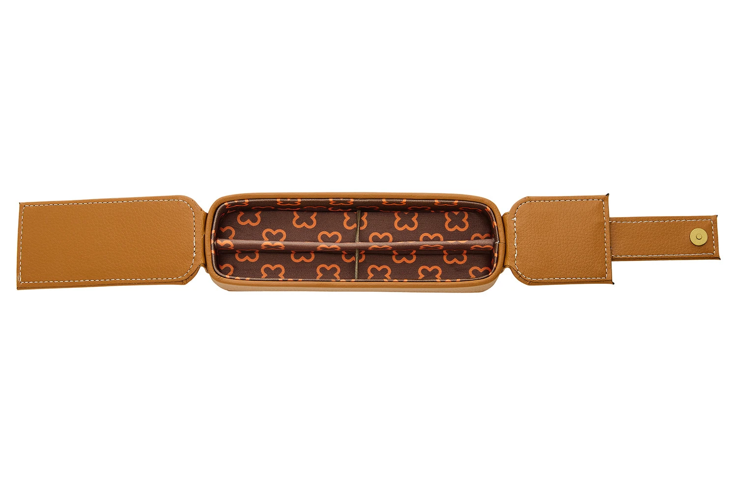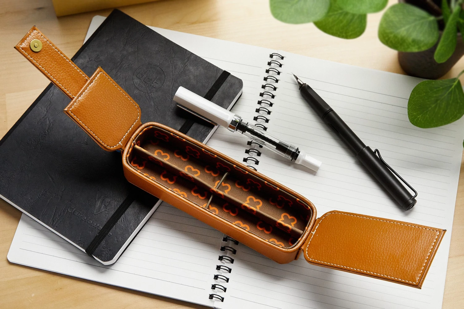 This tan synthetic leather case holds up to 2 pens, each held snug in its own fabric-covered slot. The cover snaps in place to keep the pens secure, and the bottom flap folds down for ease of use.