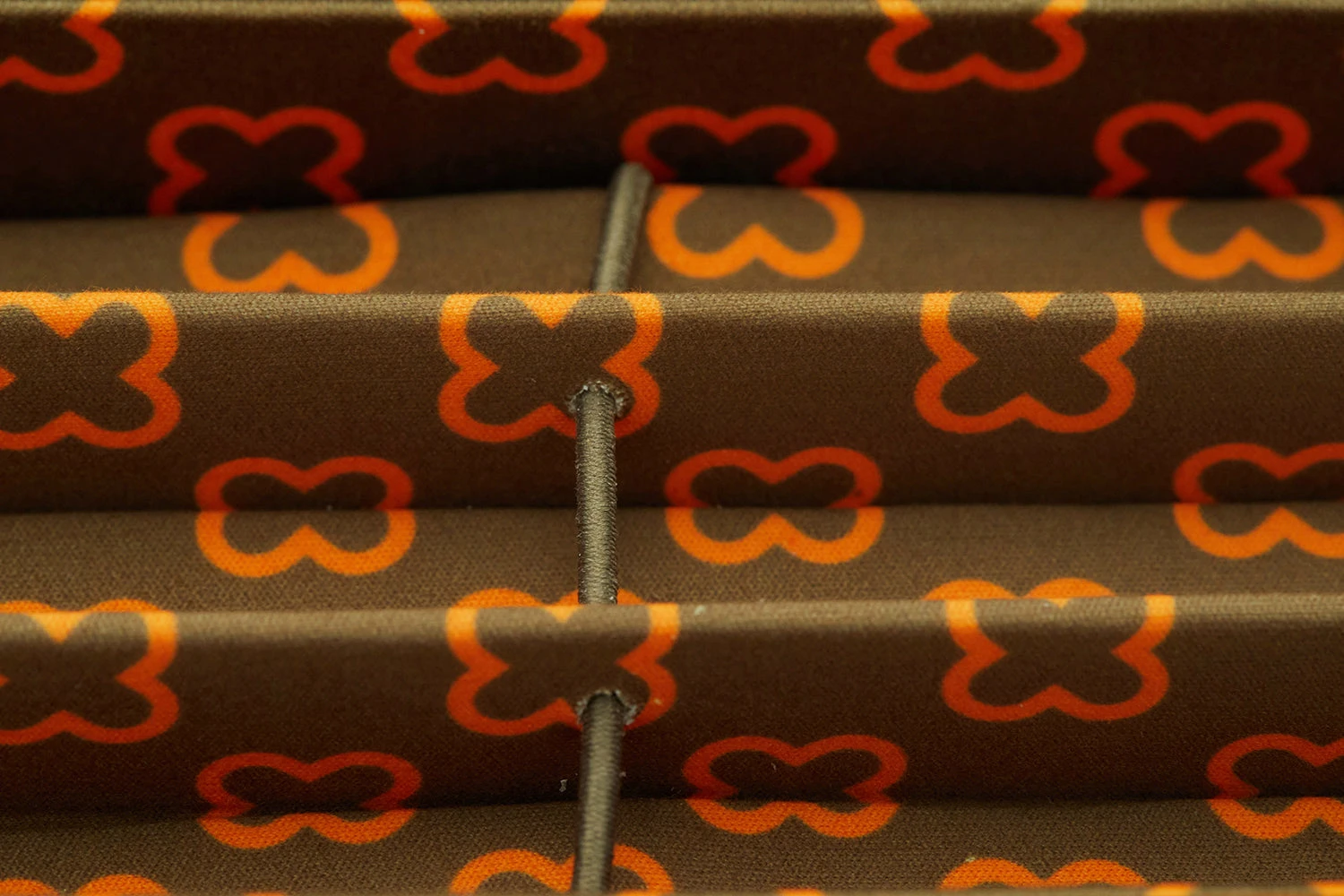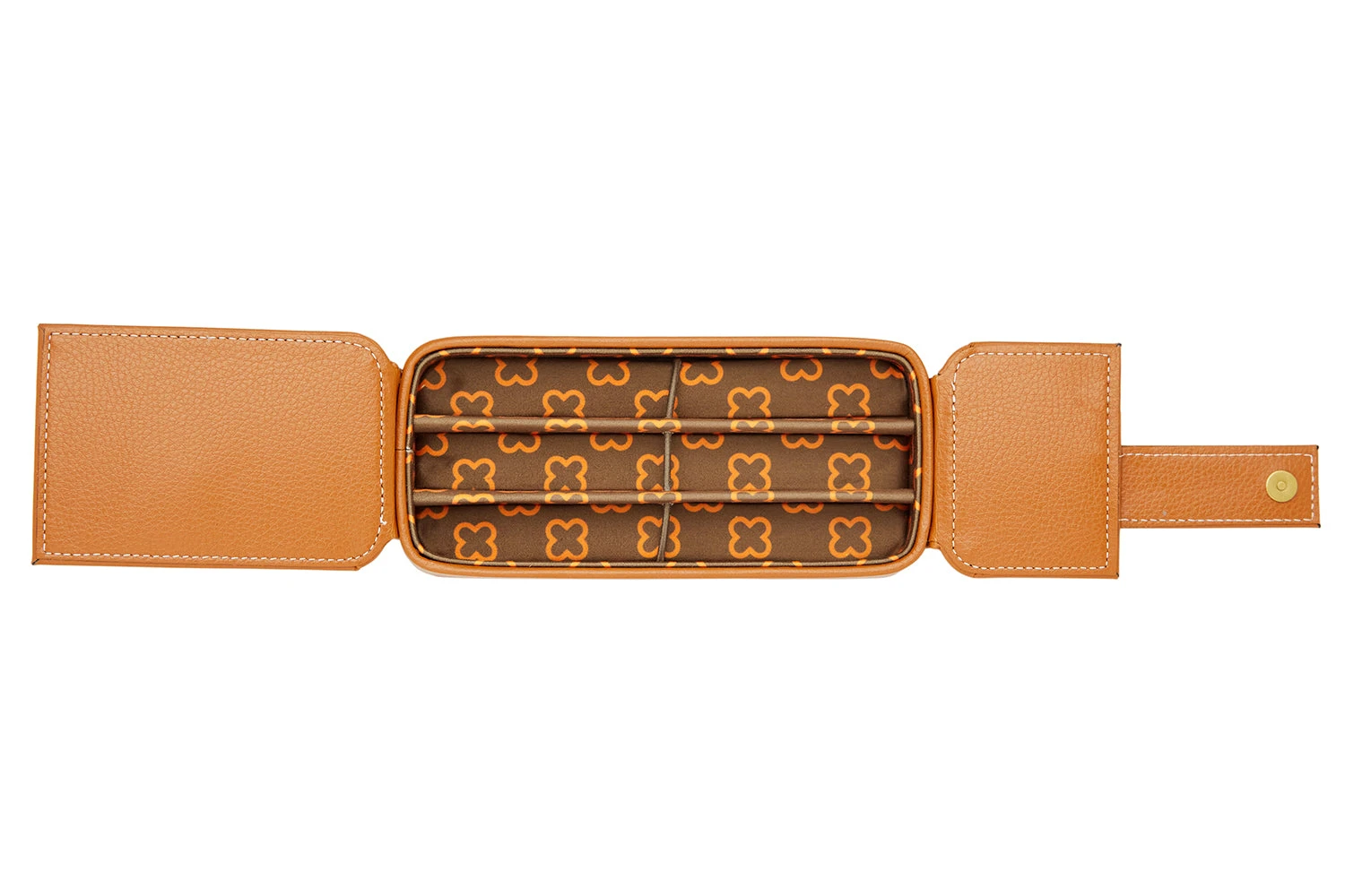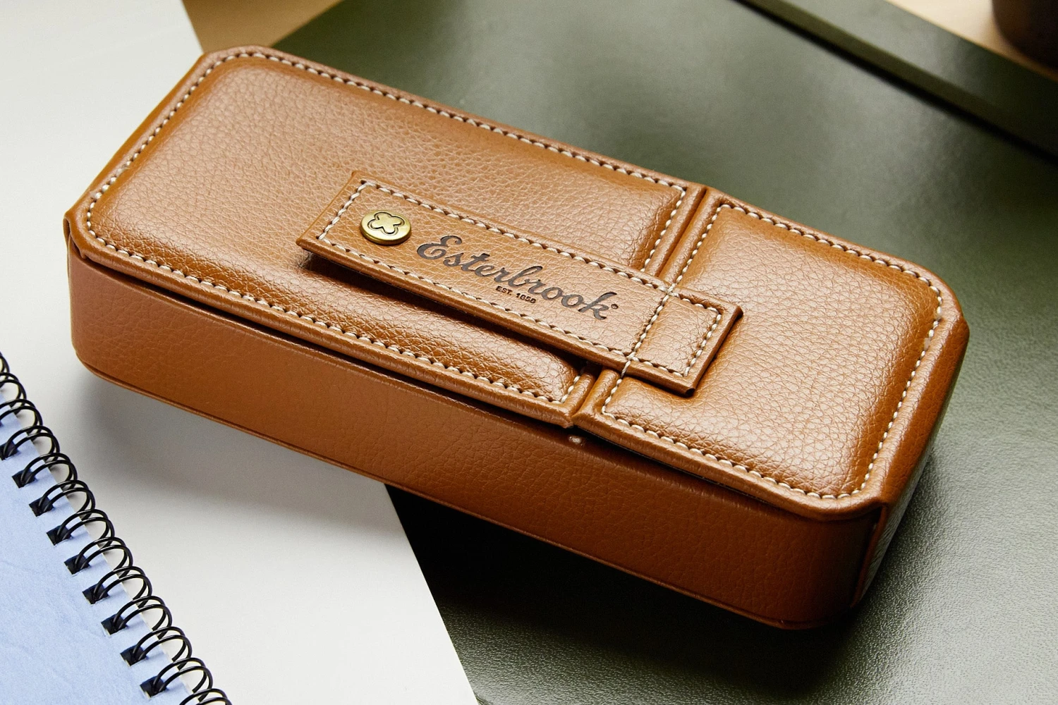 This tan synthetic leather case holds up to 3 pens, each held snug in its own fabric-covered slot. The cover snaps in place to keep the pens secure, and the bottom flap folds down for ease of use.