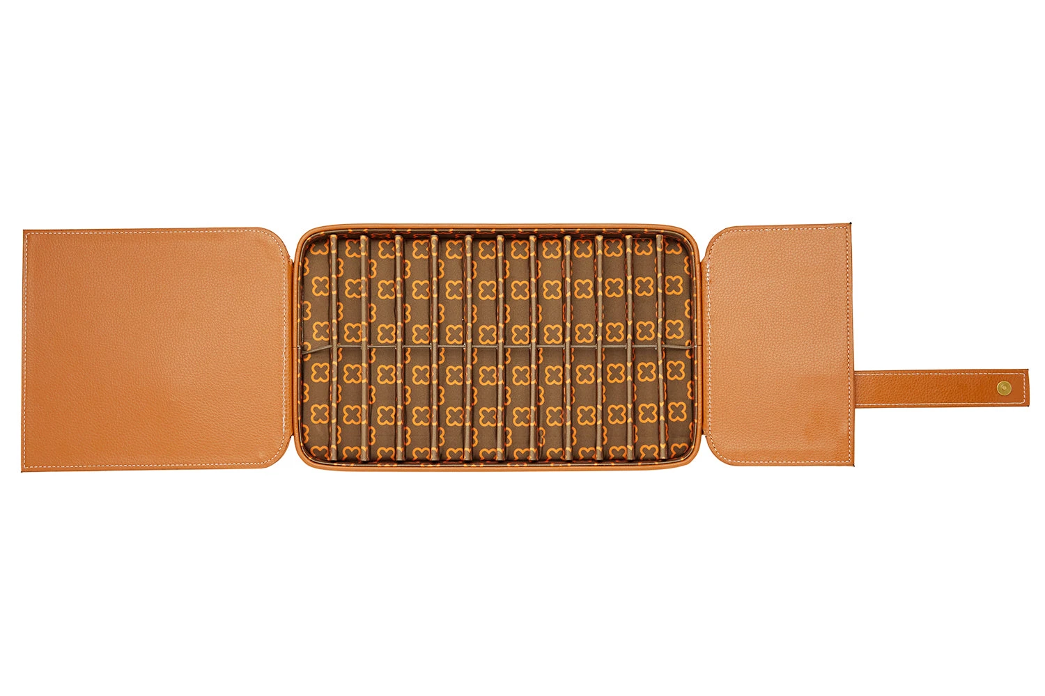 This tan synthetic leather case holds up to 12 pens, each held snug in its own fabric-covered slot. The cover snaps in place to keep the pens secure, and the bottom flap folds down for ease of use.