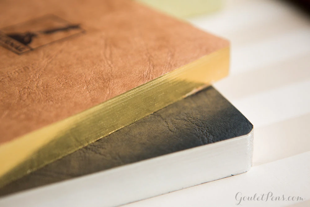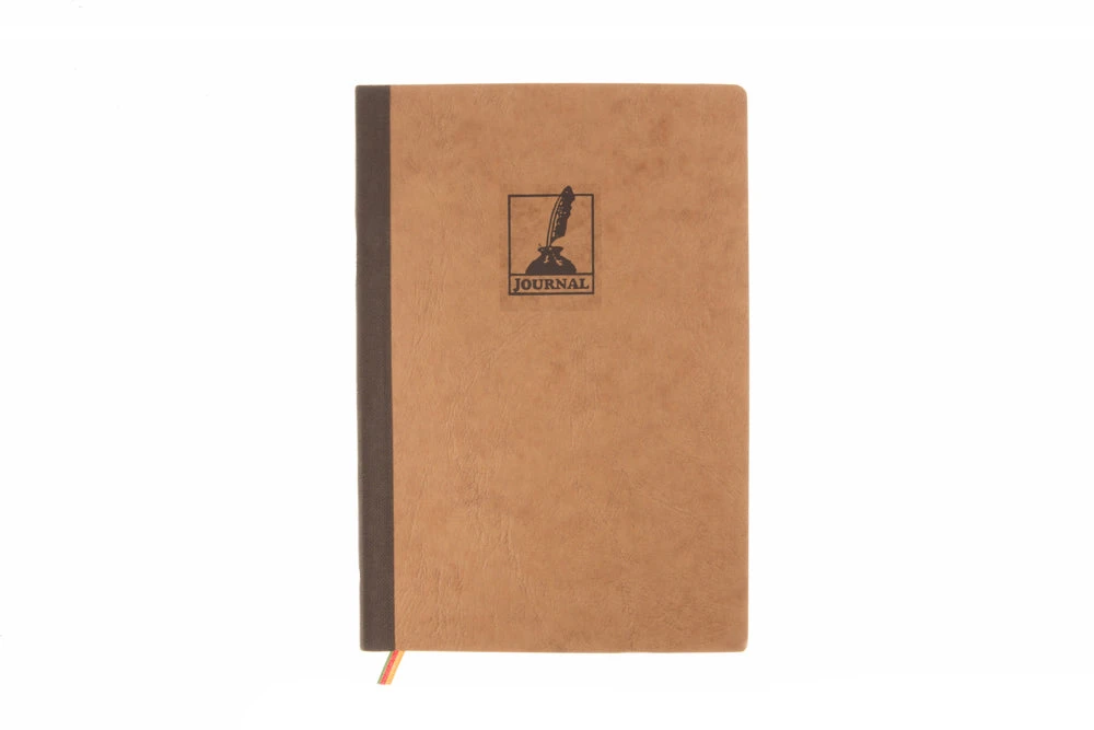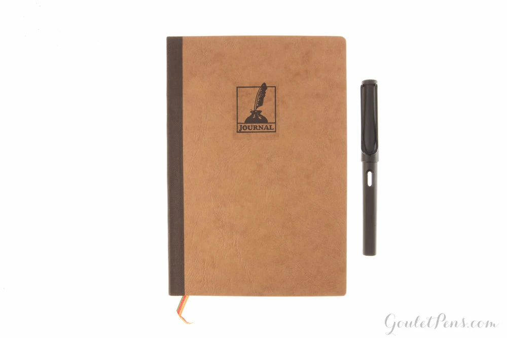 This A5-sized Exacompta Basic journal contains ruled paper with a tan cover and gold edging. The paper is 25% cotton, pH neutral, 100g off white paper — the same as G. Lalo Vergé de France stationery. A ribbon marker helps you keep your place.