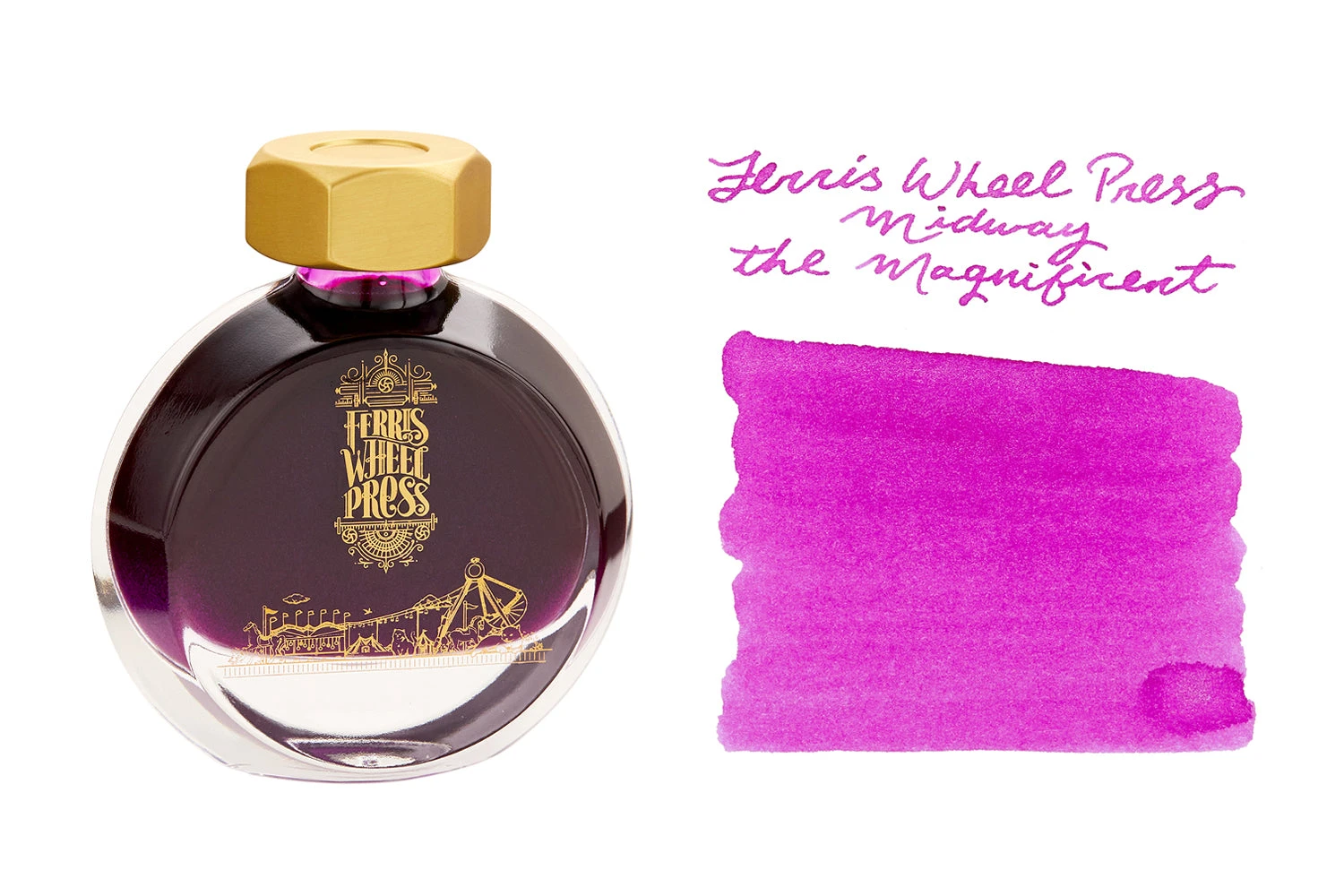 38ml glass bottle of Ferris Wheel Press Midway the Magnificent fountain pen ink, a fuchsia ink with glistening blue shimmer.