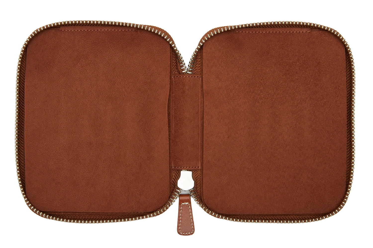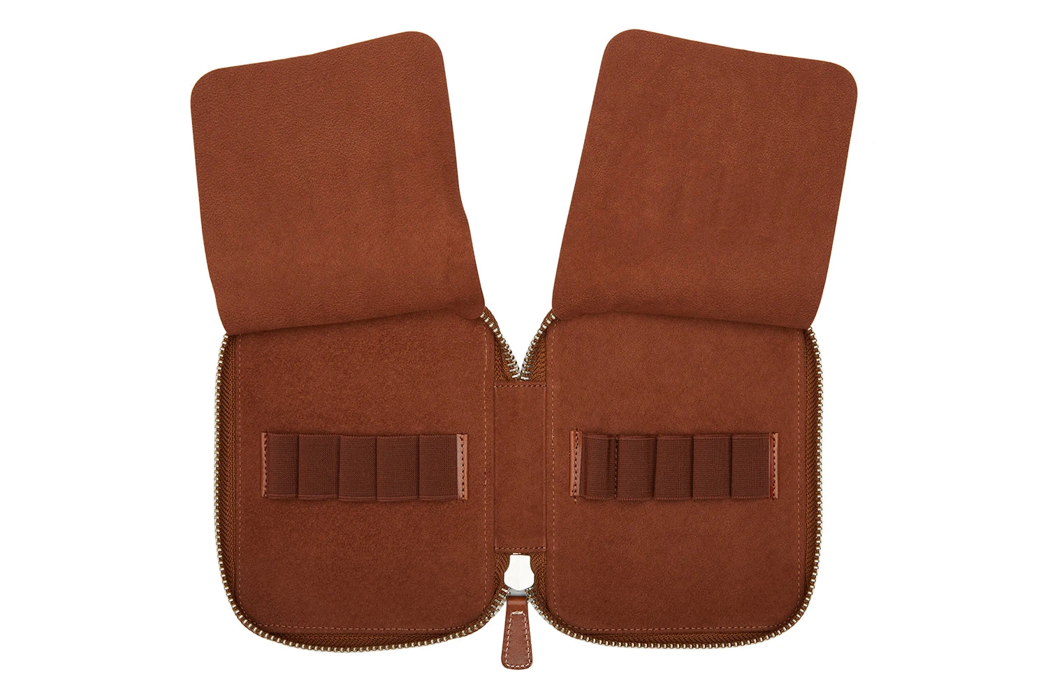 This pen case measures 160 mm x 125 mm x 30mm (6.3″ x 5″ x 1.2″). It is made of 100% vegetable tanned cow leather with a velvet lined interior and a YKK zipper. It is hand stitched using waxed polyamide thread. The edges are beveled, waxed and burnished for a finished look.