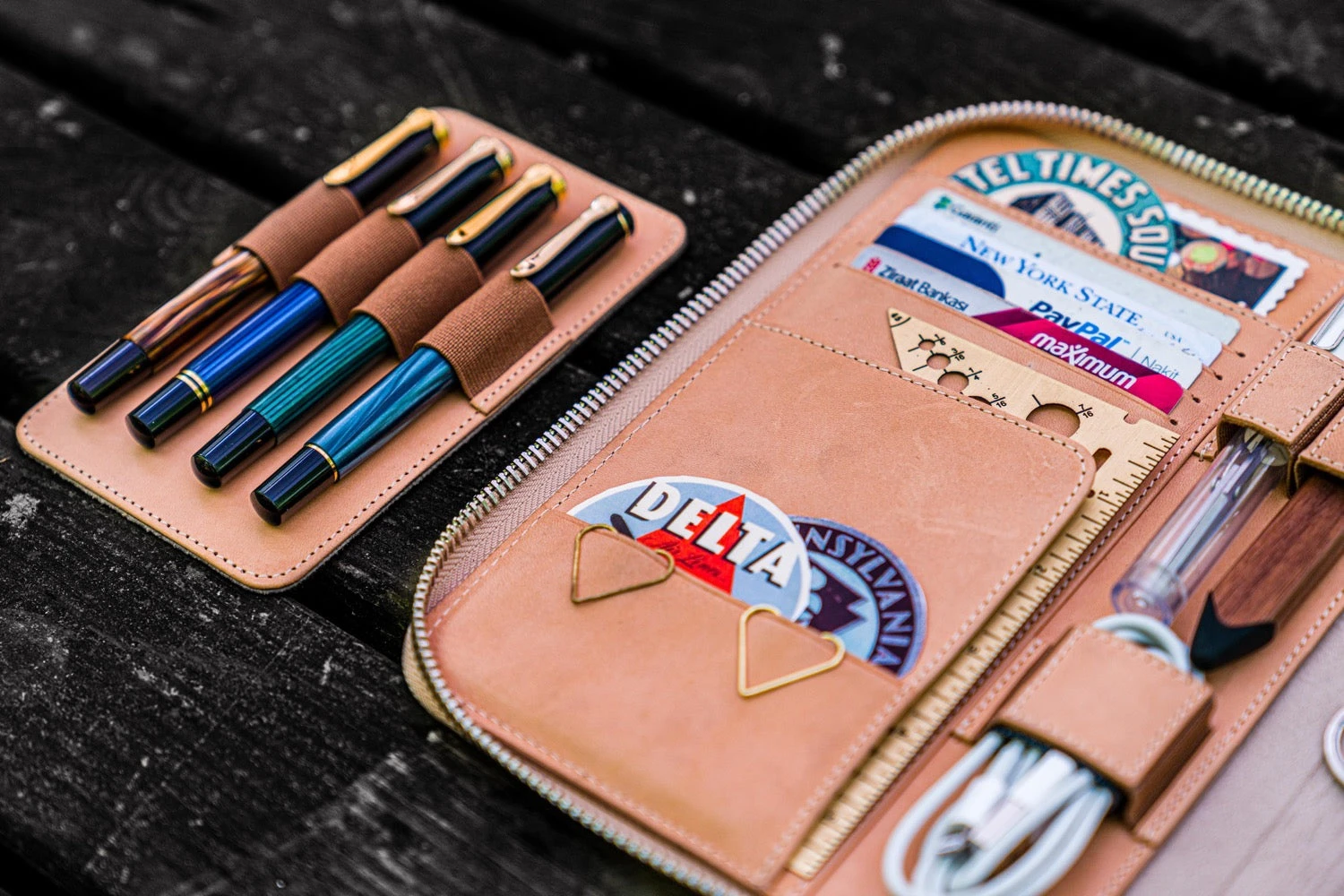 Save yourself the hassle of digging around your bag by keeping your valuables safe and secure in one place. This Galen Leather A5 zippered notebook folio is the perfect way to store your everyday essentials for work, study, or personal use. It has 4 credit card holders and a long pocket that keep your passport or your mobile phone. Under the left side, there is a sleeve for storing your iPad device. On the right, you can store a hard or soft cover A5 notebook. There are slots to support a sidebound or topbound notebook.