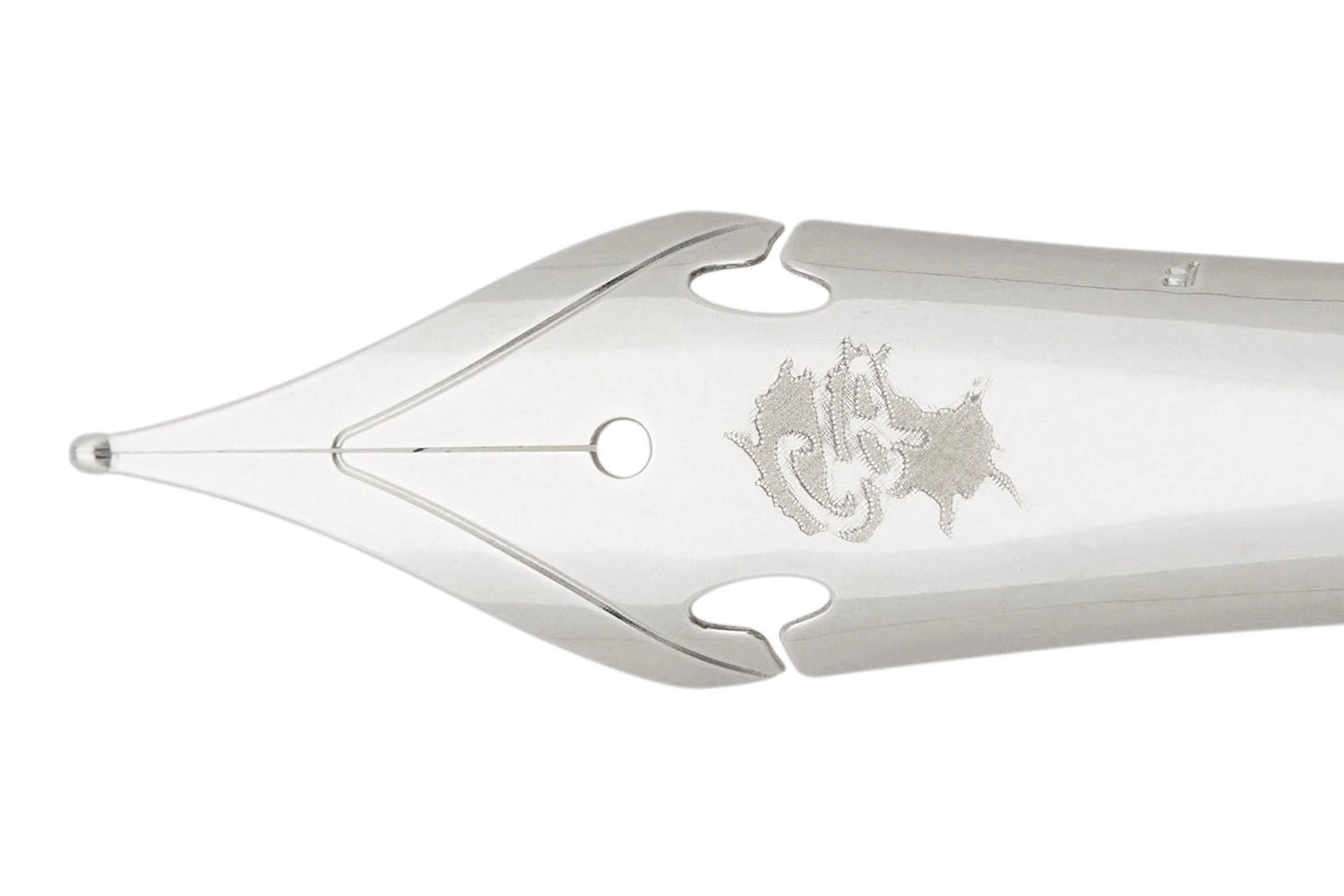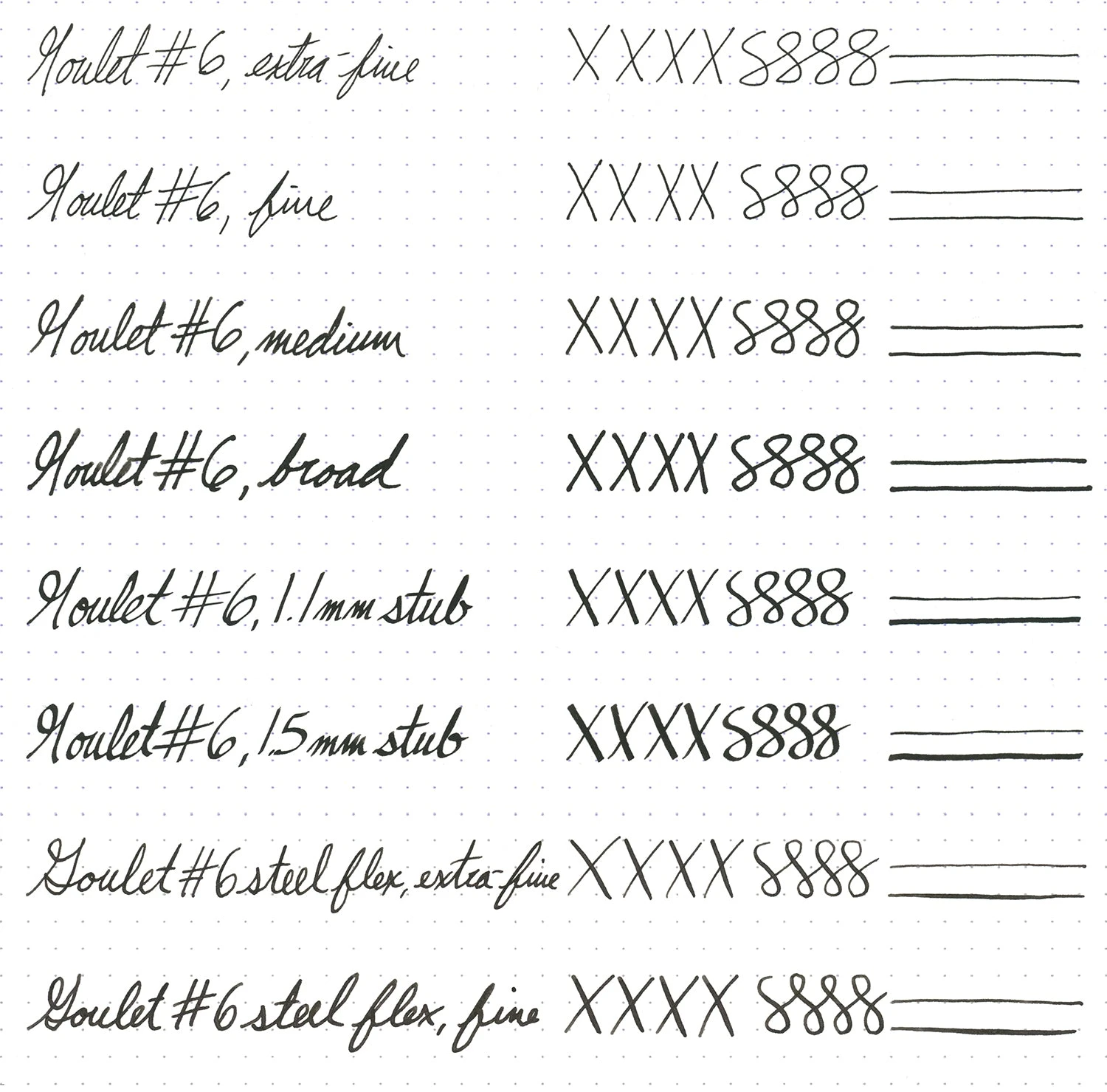 Polished stainless steel #6 flex nib, made in Germany by JoWo and engraved with the Goulet Pens “GP” ink splatter logo. This nib will fit most fountain pens that accept a #6 size nib; feed and housing not included.