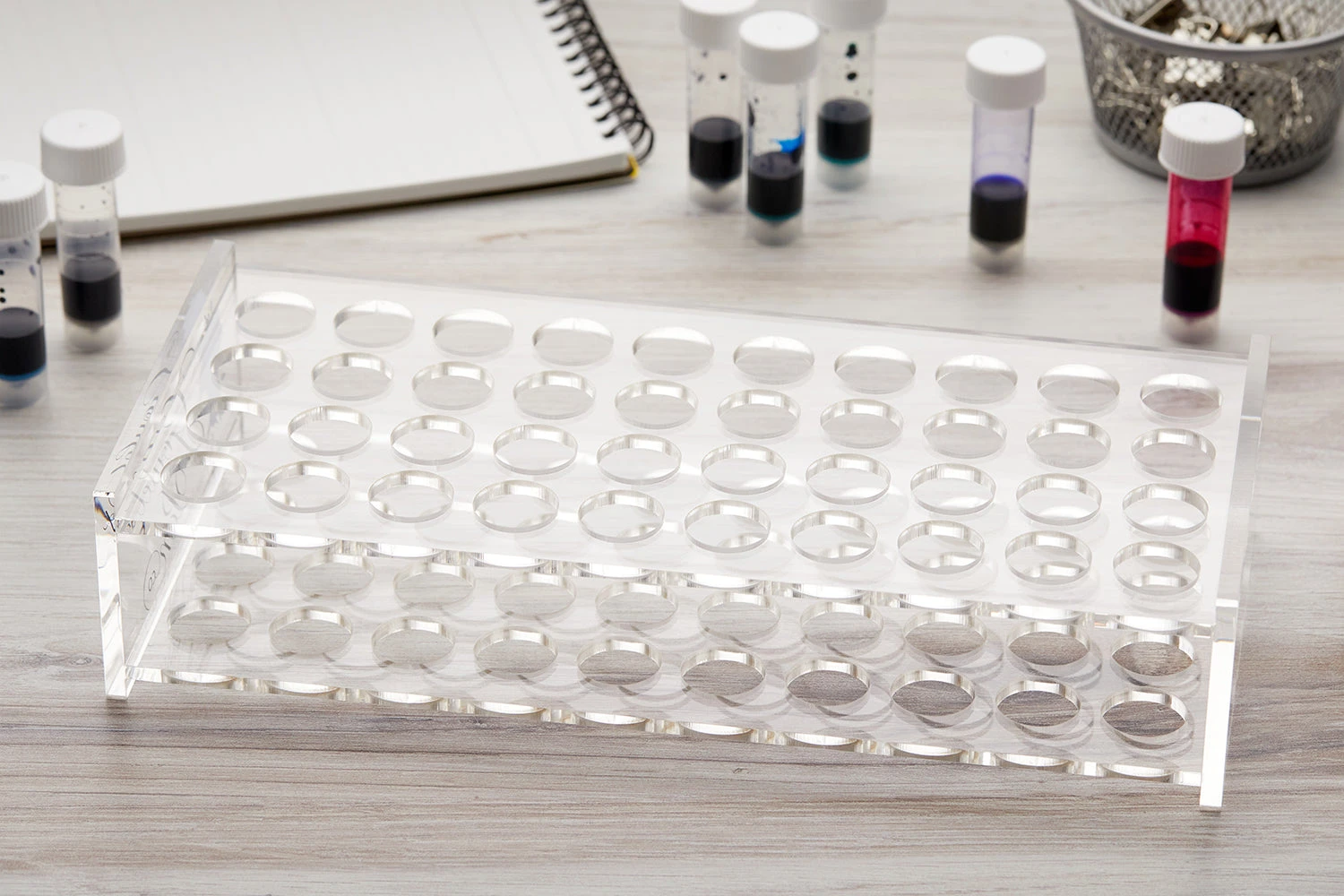 This vial holder measures 249.0mm (9.80in) in length, 110.9mm (4.37in) in width, and 54.5mm (2.15in) in height. The holes for the ink samples are 18mm in diameter.