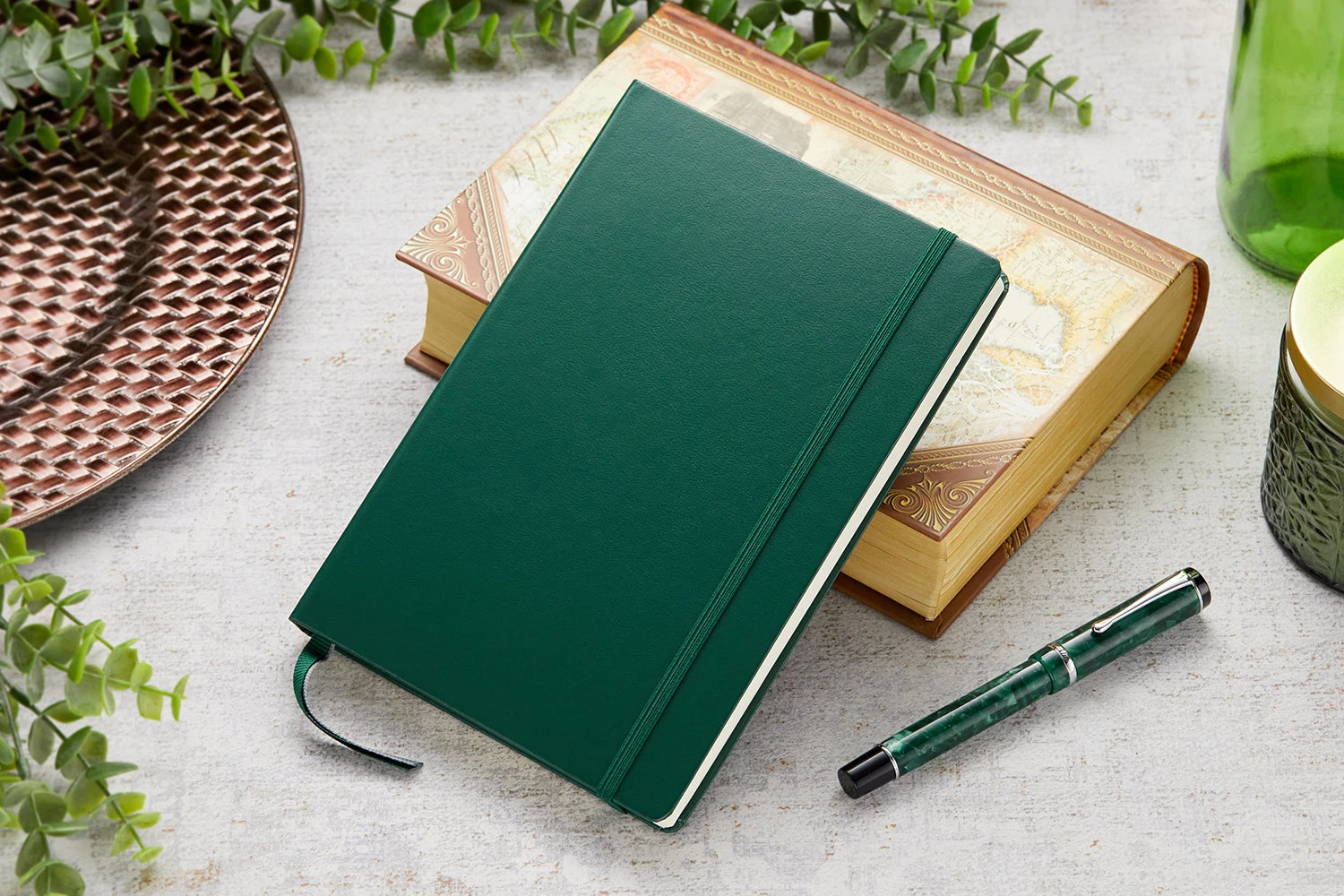 This medium A5-sized dark green Leuchtturm1917 hardcover notebook is equally suited for the desk and for use on the move. It contains 249 numbered pages (125 sheets) of 5mm dot grid 80g ivory paper. Features include an expandable pocket, a blank table of contents, two ribbon page markers, elastic band fastener, stickers for labeling/archiving, and it opens flat.
