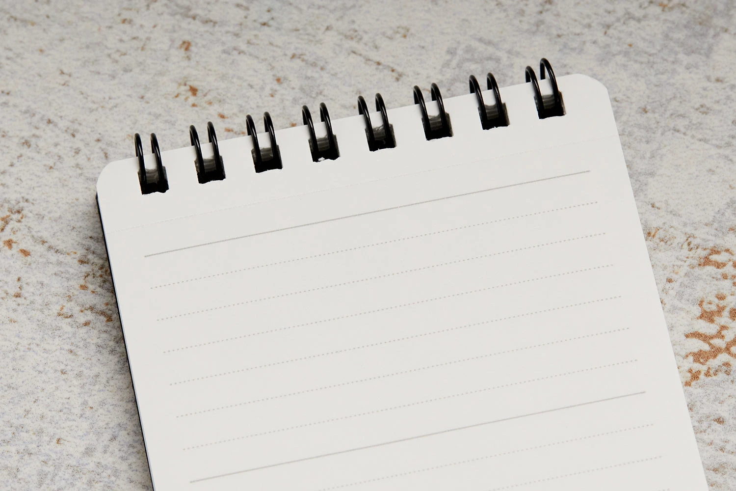 Made in Japan, this B7-sized notepad features 50 sheets of white acid-free 68gsm lined paper. The black double wire top spiral binding matches the black plastic cover. The notebook features 5mm line spacing with 21 rows per sheet (with a bold line every 7 rows), and every page is micro-perforated.