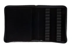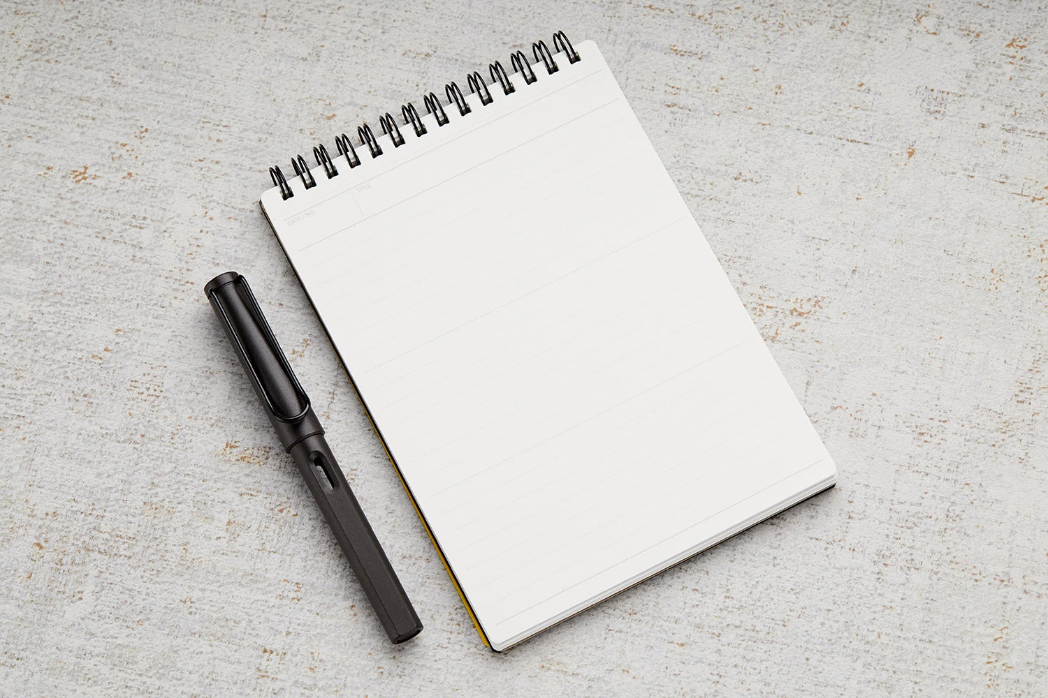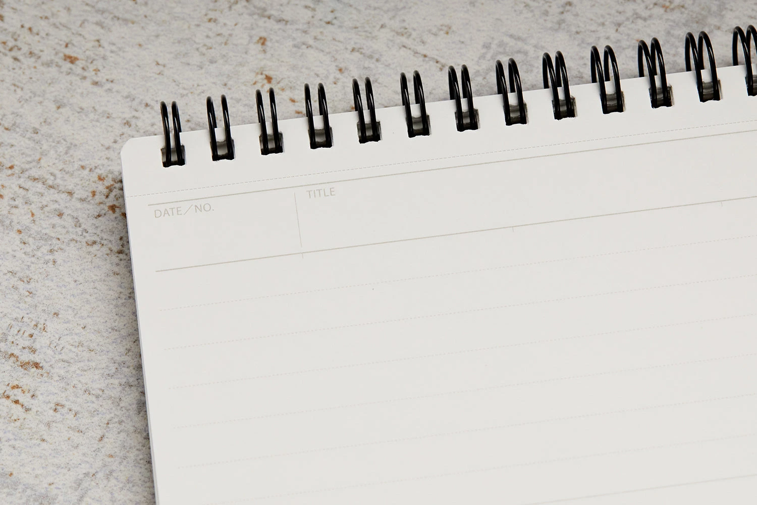 Made in Japan, this B6-sized notepad features 50 sheets of white acid-free 80gsm lined paper. The black double wire top spiral binding matches the black plastic cover. The notebook features 7mm line spacing with 21 rows per sheet (with a bold line every 7 rows), and every page is micro-perforated. Each sheet contains a blank margin at the top with a space for the date and title.