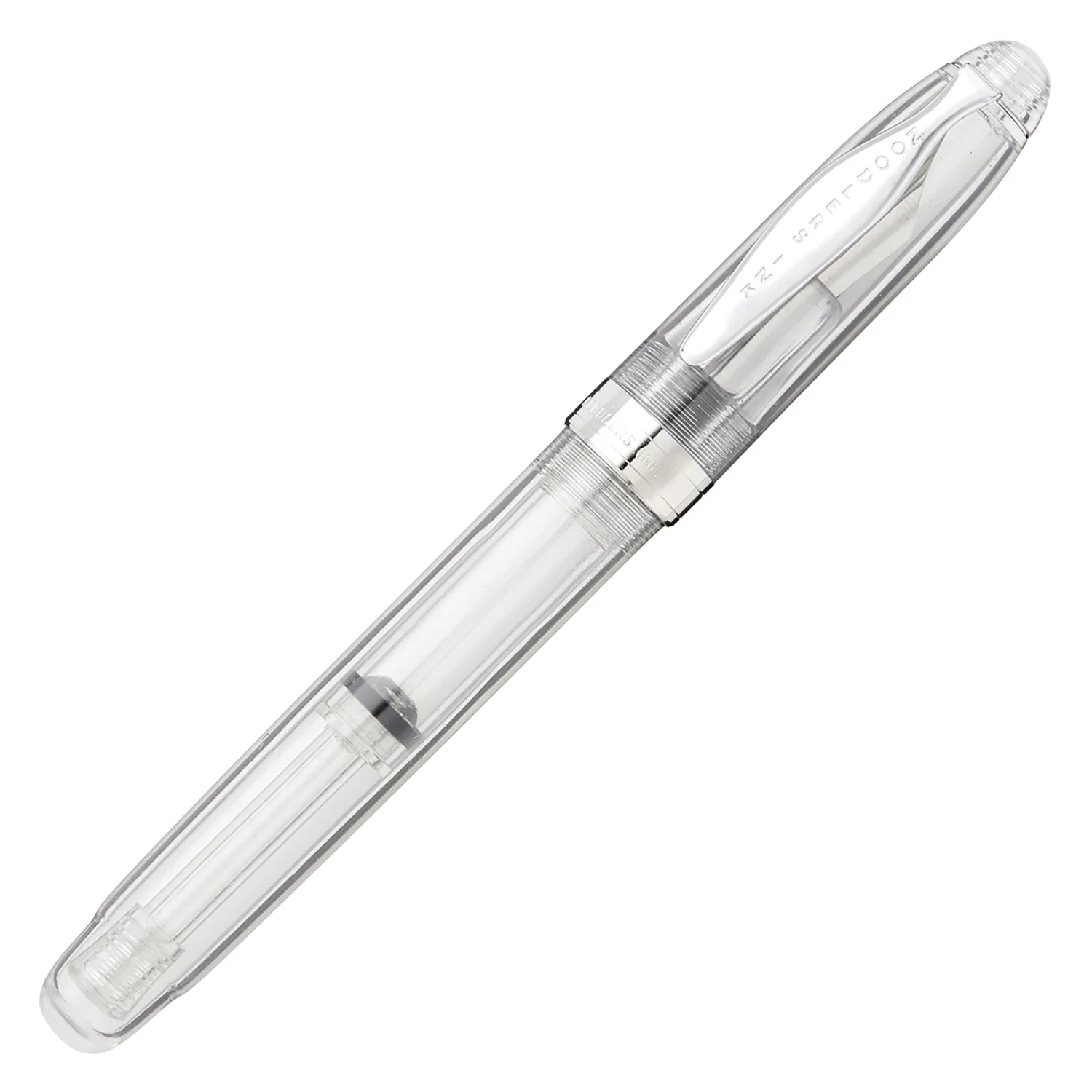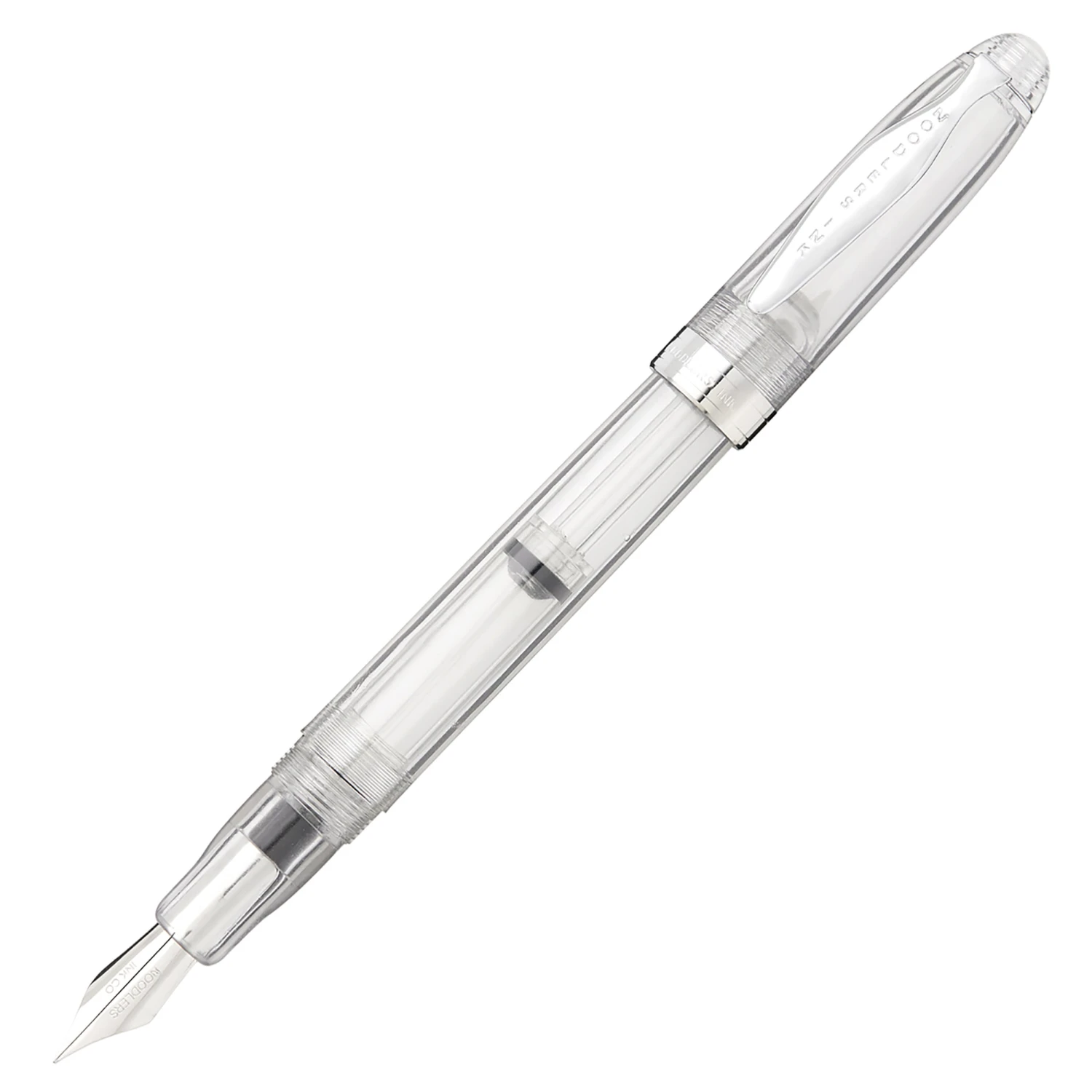 The Noodler’s Ahab flex pen features a steel flexible #6 nib and a slide piston mechanism. If you’d like, you can even remove the piston mechanism and use the pen as an eyedropper for a massive 6ml ink capacity. This clear demonstrator Ahab is made of a celluloid derivative and is technically biodegradable and formed from a “renewable resource”. The vegetal resin body of this pen may show particles or striations within the material. This is most noticeable in demonstrators and bright colors.