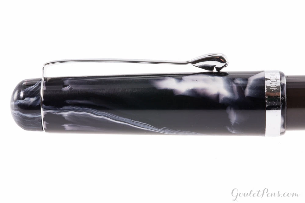 The Noodler’s Konrad flex pen is smaller than the Ahab, but larger than the Nib Creaper. This white and black fountain pen features a steel flexible nib and a twist piston mechanism with a blind cap. The Konrad is made of a celluloid derivative and is technically biodegradable and formed from a “renewable resource”. The vegetal resin body of this pen may show particles or striations within the material. This is most noticeable in demonstrators and bright colors.