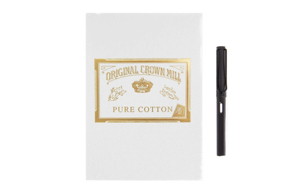 A practical pad of Original Crown Mill 100g, 100% cotton, natural white, woven writing sheets. This A5 sheet size is just right for a brief letter. This tablet includes 50 removable sheets. Matching Pure Cotton envelopes are available separately in packages of 25. Made in Belgium.