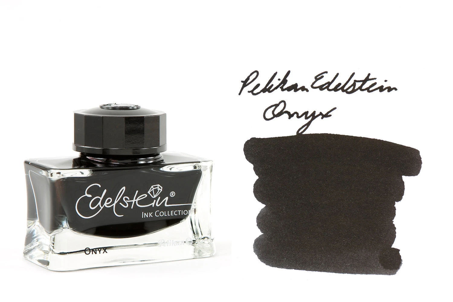 50ml bottle of Pelikan Edelstein Onyx black fountain pen ink. Set in a beautiful inkwell glass bottle.
