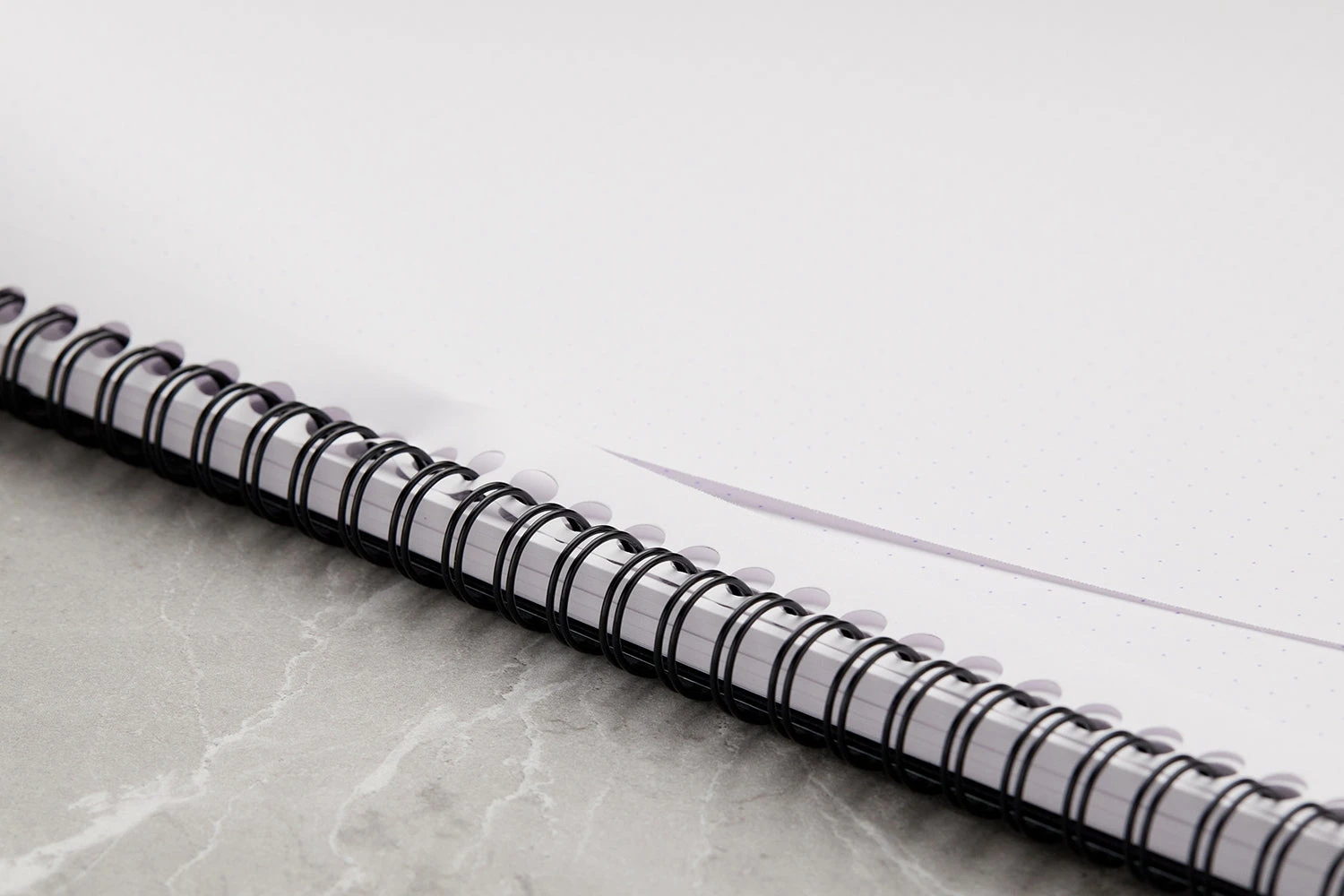 This oversized black wirebound Rhodia notebook features 80 sheets (160 pages) of extra white 80g acid-free, pH neutral dot grid paper and a coated and waterproof cover. Each sheet is microperforated for easy removal, and dots are spaced 5mm apart.