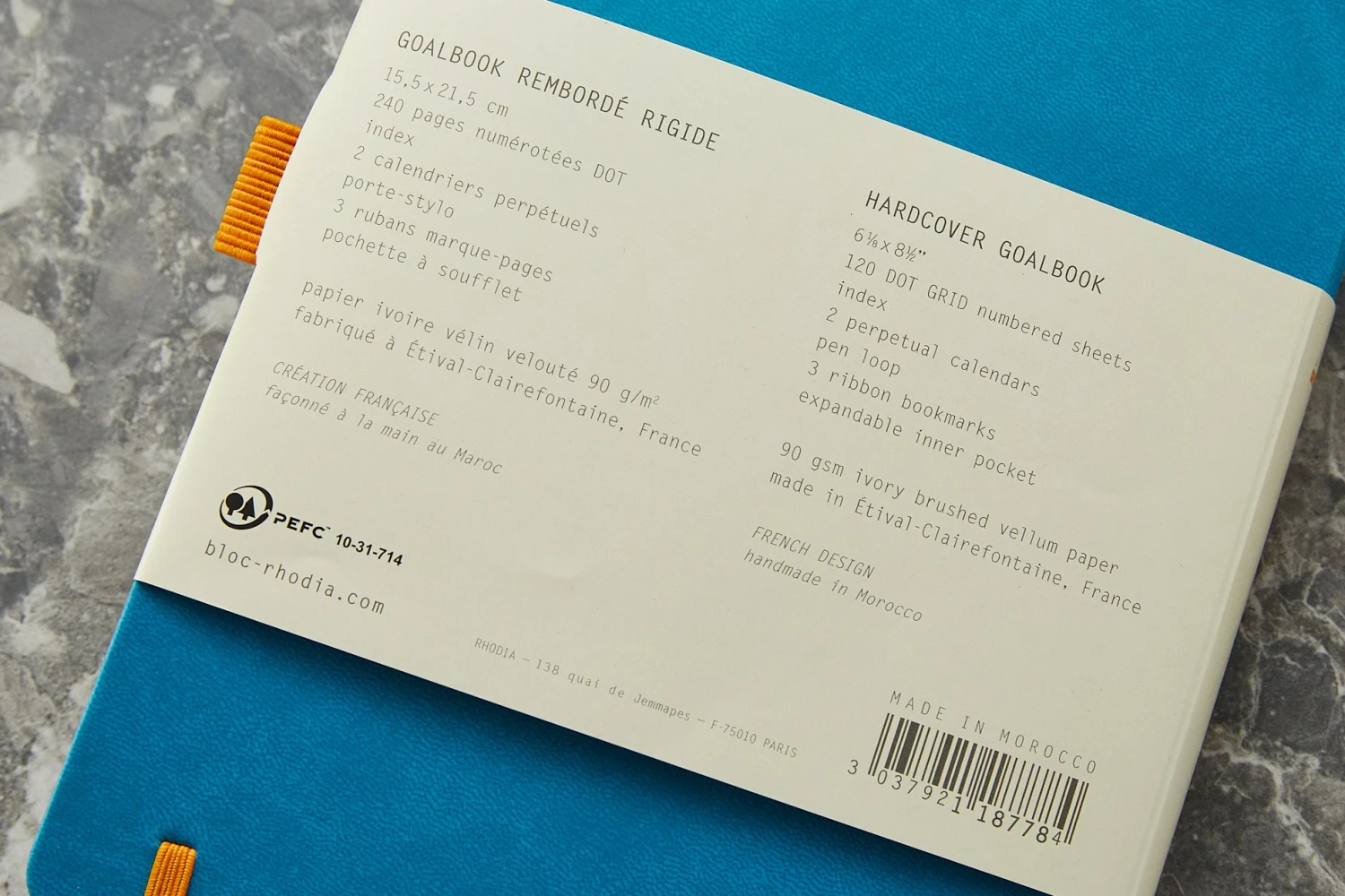 The Rhodia Goalbook’s features include a 6-page table of contents, an undated annual calendar, and undated monthly pages. Each notebook also features numbered pages, three ribbon bookmarks, an attached orange pen loop, an expanding back pocket, glued spine, and an orange elastic closure.
