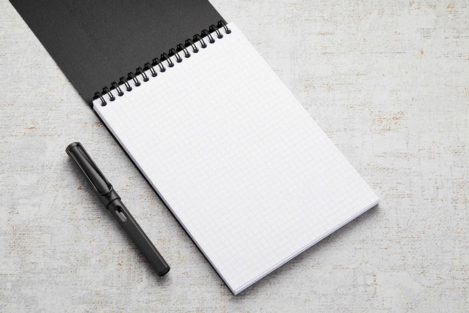 This A5-sized black Rhodia top wirebound notepad features 80 sheets of extra white 80g acid-free, pH neutral 5mm graph paper. Each sheet is microperforated at the top for easy and clean removal. There is a hard cardboard back for writing support. These economical pads are a favorite of artists, designers, writers, and notebook fans for notes, sketching, and hand drafting. People love them for their grids, smooth paper, and iconic cover.