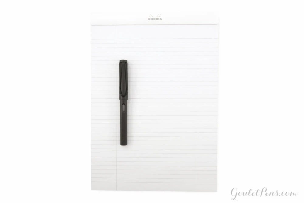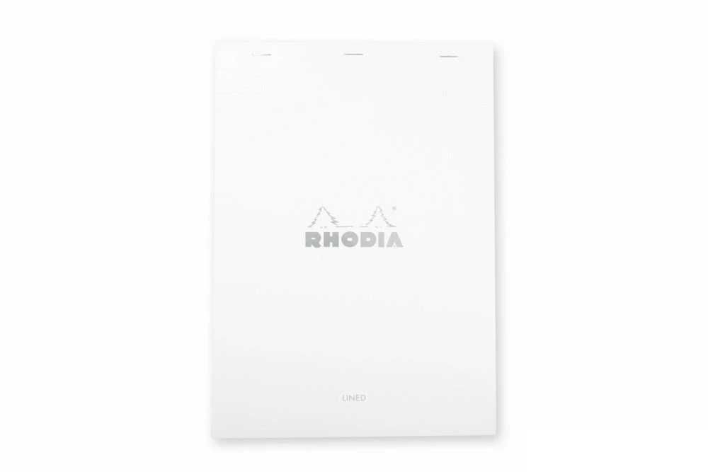 This A4-sized white Rhodia notepad features 80 sheets of extra white 80g acid-free, pH neutral ruled paper.Lines are spaced 7mm apart, and there is a subtle vertical margin line on the left. Each sheet is microperforated at the top for easy and clean removal. The top stapled cover folds back cleanly, and there is a hard cardboard back for writing support. These economical pads are a favorite of artists, designers, writers, and notebook fans for notes, sketching, and hand drafting. People love them for their smooth paper and iconic cover.
