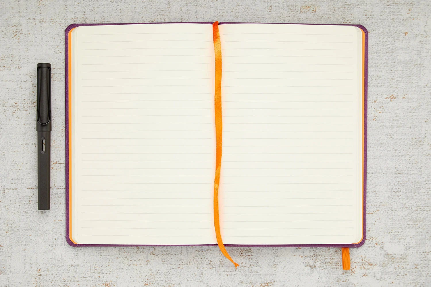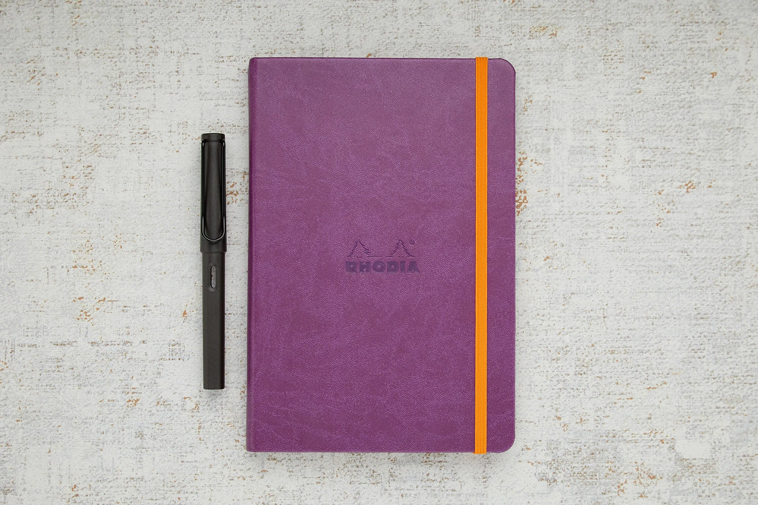Known as the “Webbie”, the Rhodia Webnotebook is the choice for fountain pen users and everyday note taking. This A5-sized notebook has a purple leatherette hard cover. It is filled with 96 sheets (192 pages) of premium 90g ivory Clairefontaine ruled paper. Lines are spaced 7mm apart. Other features include a ribbon marker, an orange elastic closure, an inner pocket for notes and cards, and elegant round corners.