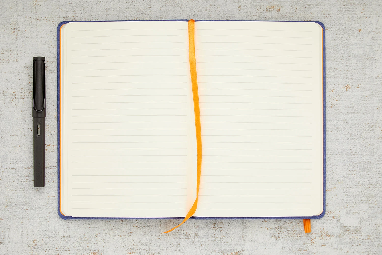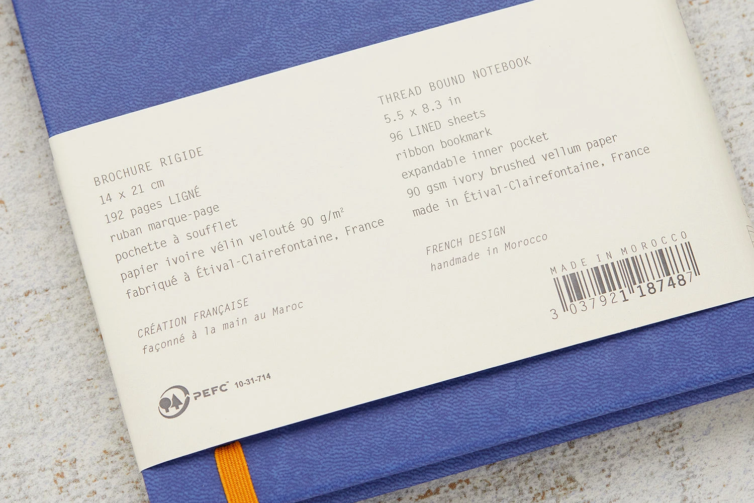 Known as the “Webbie”, the Rhodia Webnotebook is the choice for fountain pen users and everyday note taking. This A5-sized notebook has a sapphire blue leatherette hard cover. It is filled with 96 sheets (192 pages) of premium 90g ivory Clairefontaine ruled paper. Lines are spaced 7mm apart. Other features include a ribbon marker, an orange elastic closure, an inner pocket for notes and cards, and elegant round corners.