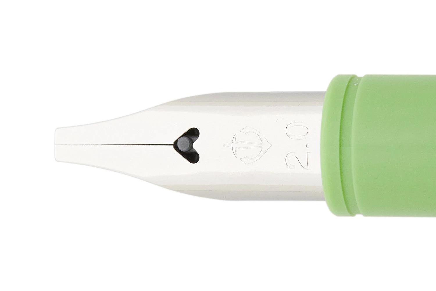 This 2.0mm Calligraphy steel nib unit has a light green accent and includes an attachable ink reservoir. It does not include the pen barrel which is available separately.