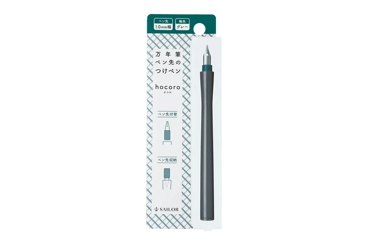 This pen comes with a gray barrel and a 1.0mm Calligraphy steel nib with a dark green accent. An attachable ink reservoir is available separately.