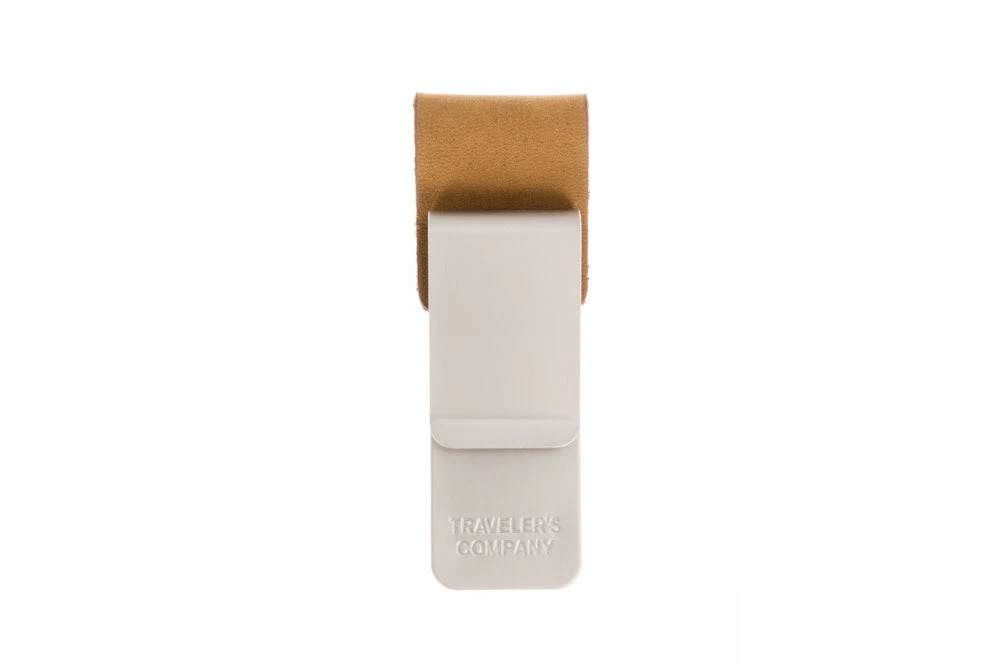 Attach this to the leather cover of the Traveler’s Notebook to hold a pen. It can hold pens of diameter up to 12mm. Metal clip, tan leather pen holder.