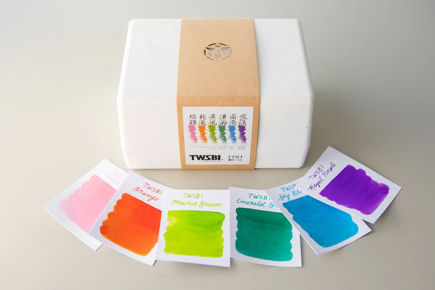A new limited fountain pen ink line from TWSBI! This 1791 bottled ink set contains the first six colors released from TWSBI, each set in an 18ml frosted glass bottle. Colors include Pink, Orange, Prairie Green, Emerald Green, Sky Blue, and Royal Purple.